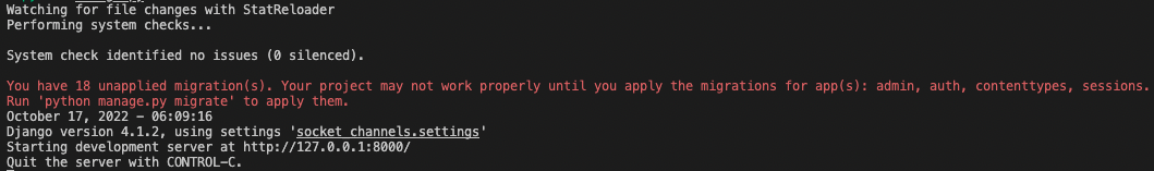 라고 되어있던 부분이 Starting ASGI/Daphne version 4.0.0 development server at http://127.0.0.1:8000/
